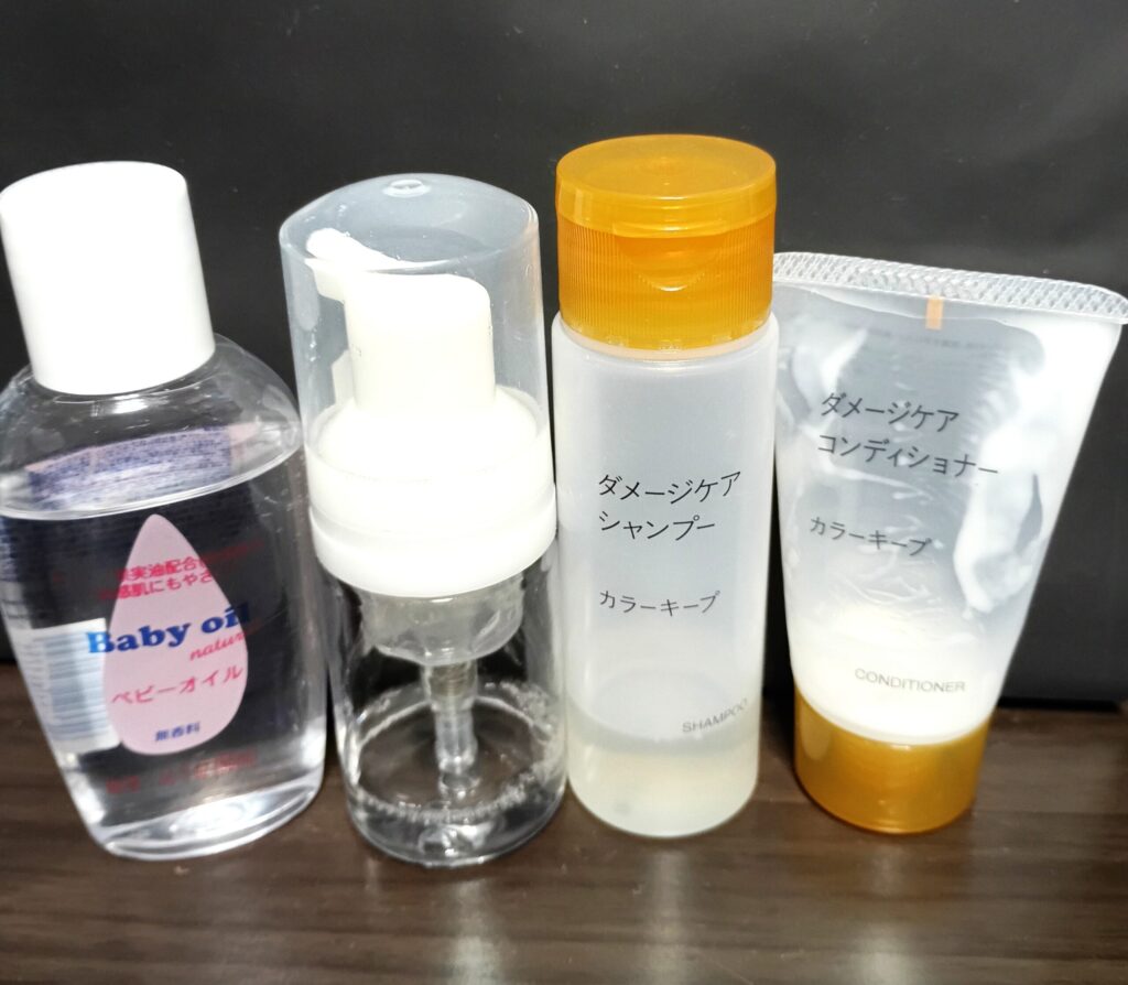 今回の旅は7日分くらい(暑すぎて途中でシャワーとかも考慮して)あればいいかなーと思って持っていきました。私はロングヘアなのですが、無印のシャンプーの量は十分でした。コンディショナーは写真のものを2本使用しました。