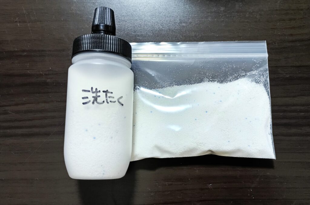 長期で旅行に行く際は左のボトル(黒蜜が入ってたボトルを洗って再利用)、短期の場合はジップロックに粉洗剤をいれて持っていきます。