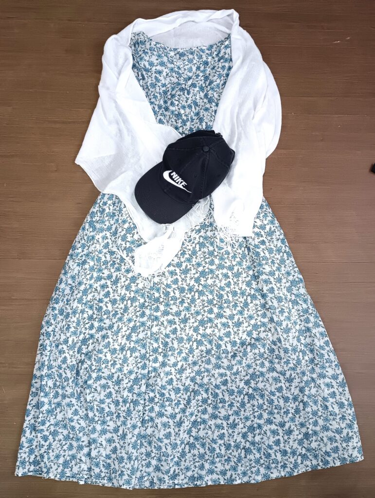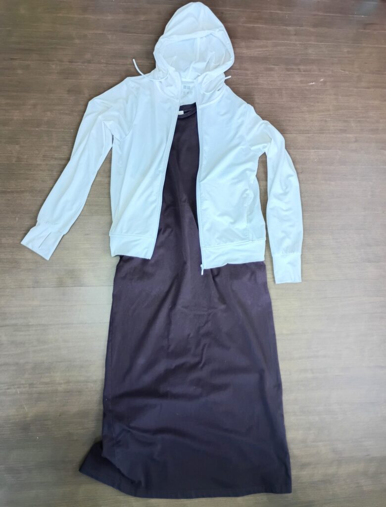現地での服装はおおむねロングワンピースに日よけパーカーかストール+帽子で統一しました。今回は海に行く予定も、ドレスコードのある場所にもいかない予定だったので、靴はスニーカー1足のみです。