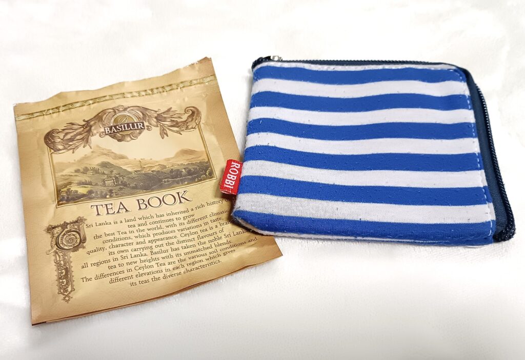 しましま財布はいつの日かダイソーで購入したもので、レシートや小銭入れにはまさかのちょうどよさそうだった緑茶が入ってたチャック袋を使用しました。