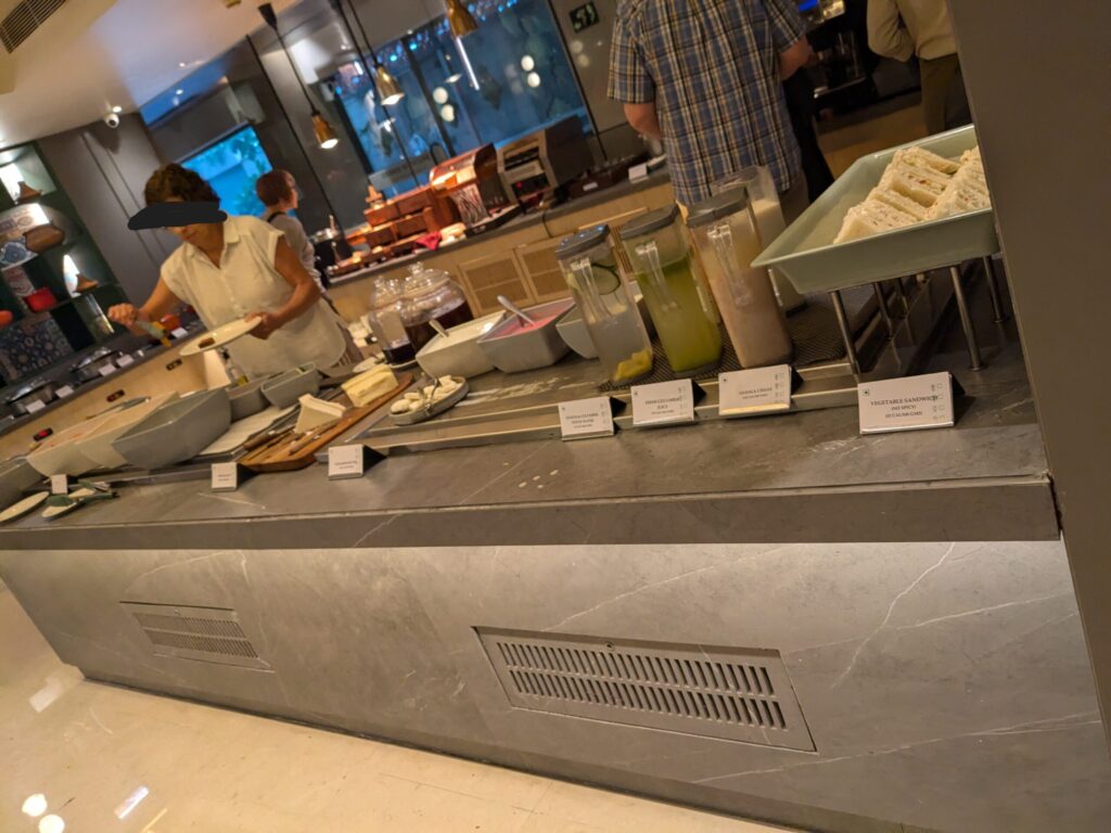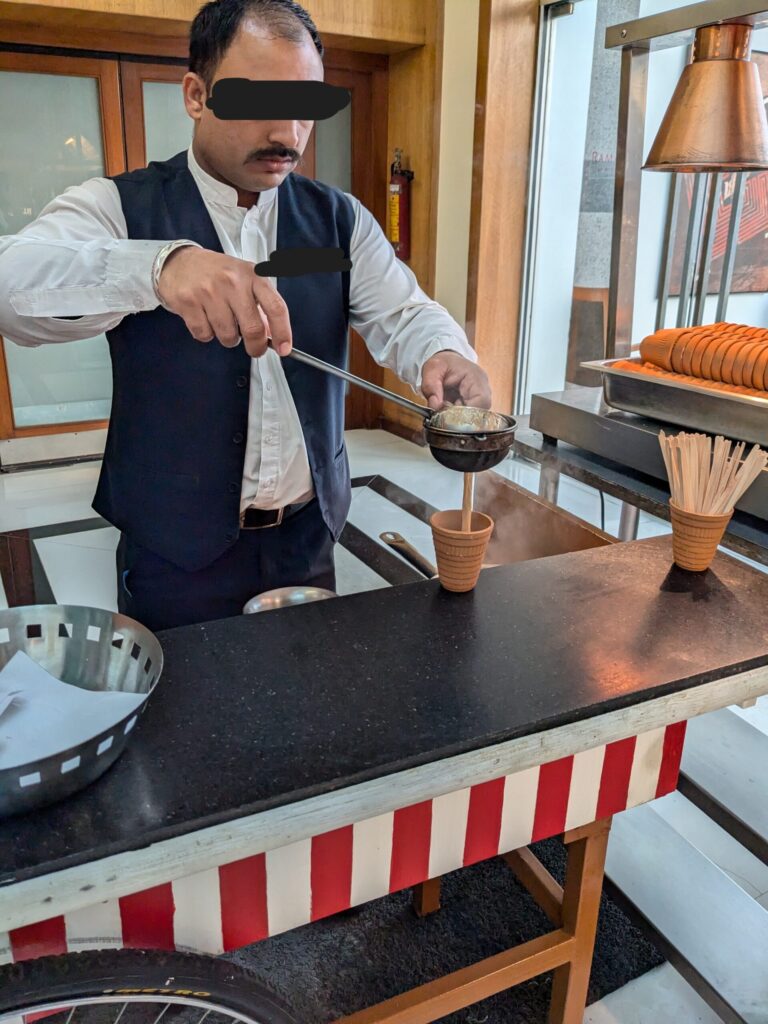 飲み物コーナー。私はお腹が痛くなるのを極度に怯えていたので、温かいチャイを選びました。写真には写ってませんが、コーヒーマシンやホットの飲み物があるコーナーもありました。