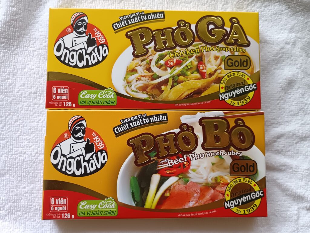 初めて購入したフォーの素。牛と鳥だしを買いました。100~150円くらいだったと思います。コンソメみたいな感じに入ってるのかなと思ったら、割とでっかい塊が3個入ってました(3回分?)。裏の表示通りの水分量だとかなり濃い味でした。味はインスタントフォーよりも本格的でおいしかったです。