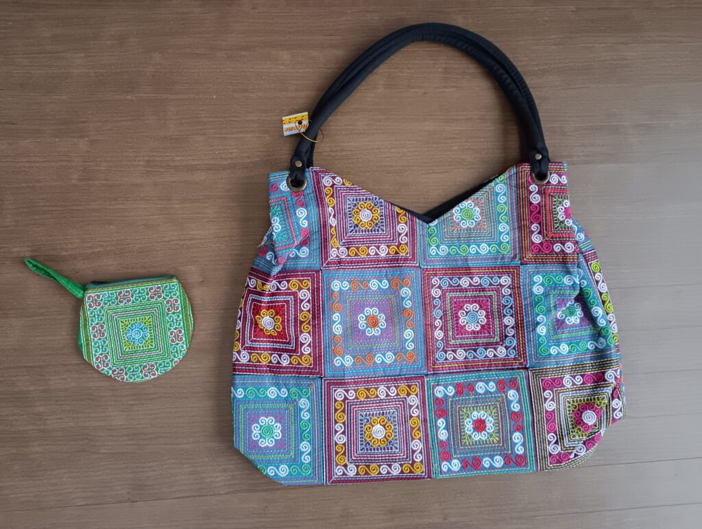 以前ベトナムホイアンに行ったときにもこんな感じのカバンがあって、欲しかったけどあきらめた過去があったので、今回購入しました。派手だけどシンプルな洋服が多い私にとってはアクセントになるかなと思います。しっかり裏地やチャックがついていたりするので、そこも気に入りました。