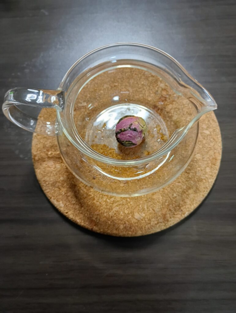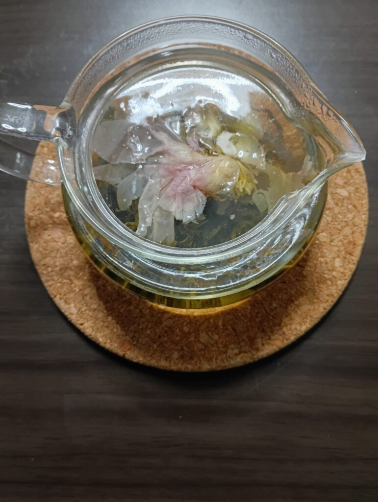 実際にお茶を入れてみるとこんな感じです。お湯を入れただけではきれいに花が開かなかったので、お箸でチョンチョンしてきれいに整えました。笑